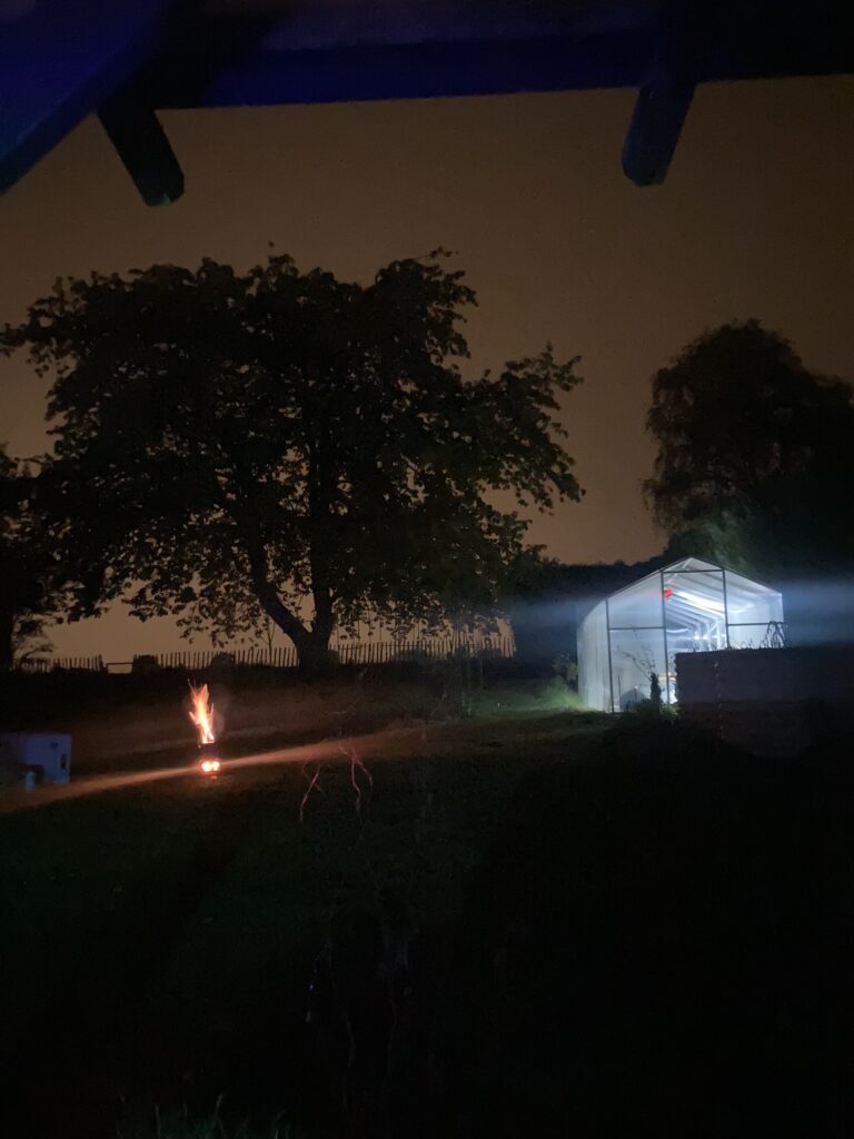 Wieczorek spędziliśmy rodzinnie w ogródku. Zaczęło trochę padać, więc siedliśmy pod daszkiem. Mąż kuzynki rozpalił ognisko.