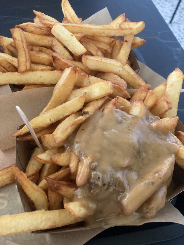 Około 13 wyruszyłyśmy w kierunku Brugii. Od śniadania trochę minęło (a jak wyjeżdżałyśmy, to zapiekanka dopiero co wylądowała w piekarniku), więc poszłyśmy coś zjeść. Jako że to Belgia, to muszą być fryty 😉 Ja wybrałam frytki z sosem pieprzowym na ciepło – wygląda dziwnie, ale było pysznie.