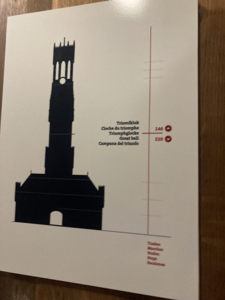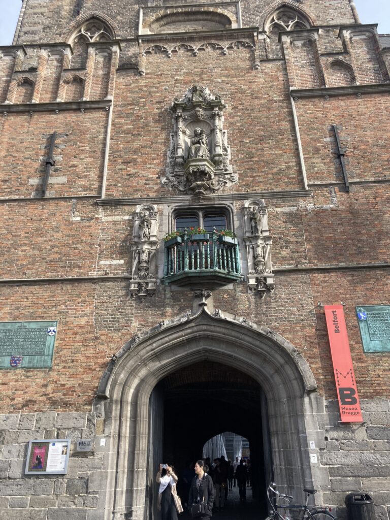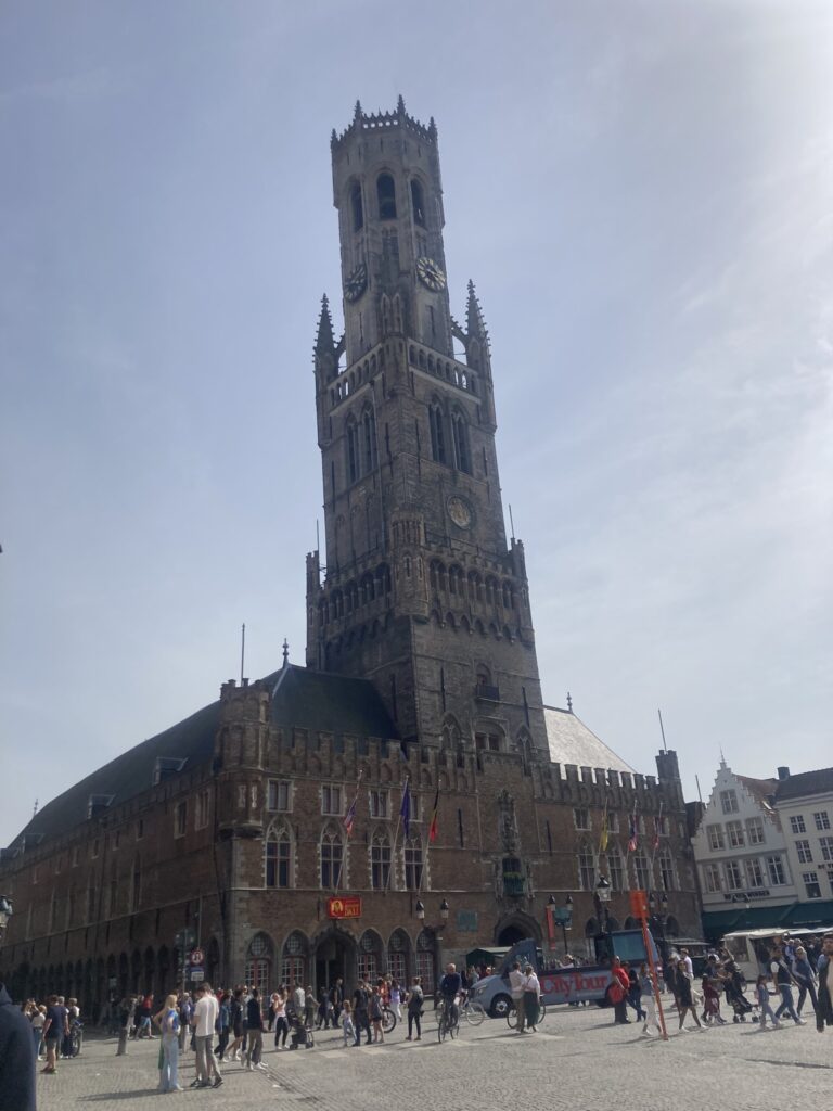 Następnie udałyśmy się w kierunku rynku, a konkretnie wieży Belfort. Taka mała dygresja – jest pewne nawiązanie do tej wieży w filmie „Najpierw strzelaj, potem zwiedzaj” („In Bruges”). Nie ma wyjścia, trzeba będzie się wspiąć na górę 😉 Okazało się jednak, że nie ma biletów na teraz – dopiero na „za ok. półtorej godziny”. Kupiłam bilet (kuzynka już była, więc miałam się wspinać sama).