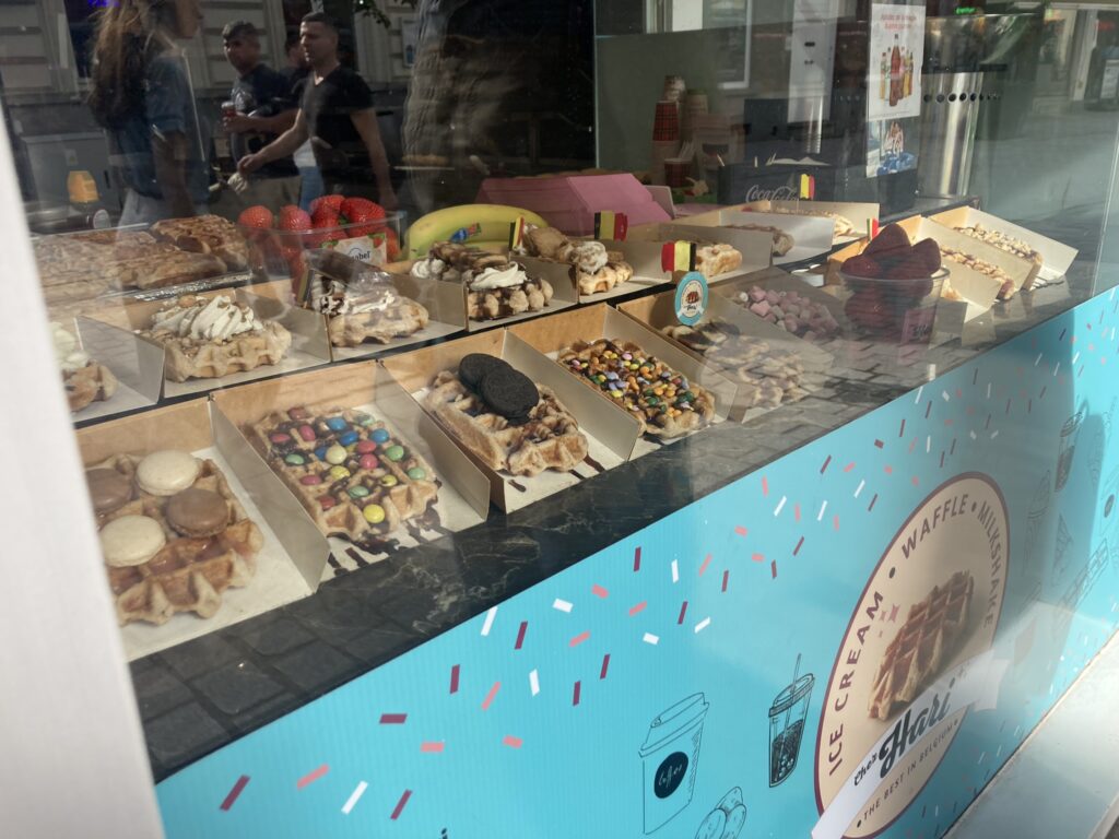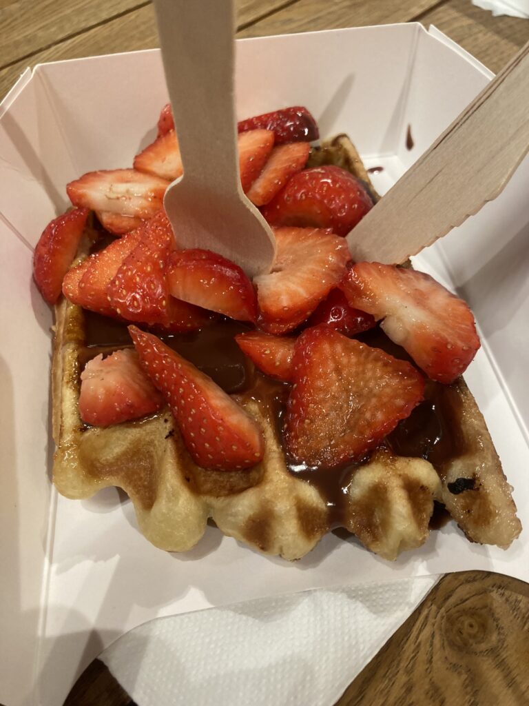 Zaopatrzyłam się we wspomniane czekoladki, kupiłam magnesy i… poszłyśmy na gofry 😉Jeju, jakie to słodkie! Wybrałam gofra z czekoladą i truskawkami, bo wydawał się najmniej przesłodzony 😊